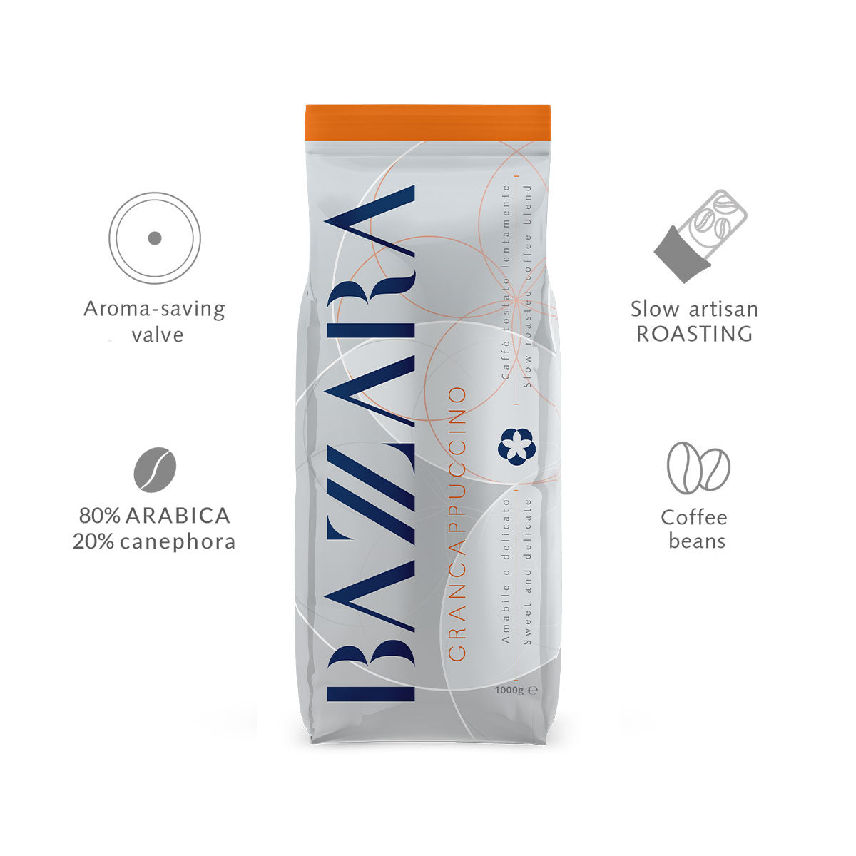 Unser Gran Cappuccino, in einer 1-kg-Packung Bohnen, ist perfekt für alle, die exzellenten Kaffee mit dem vollen Geschmack von aufgeschäumter Milch genießen möchten.